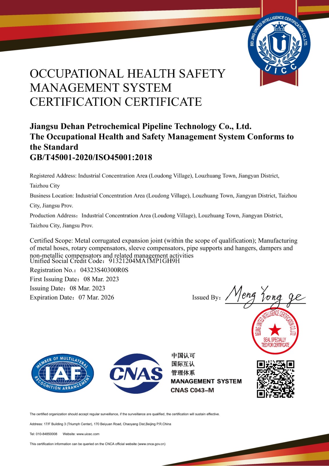 江蘇德悍石化管道科技有限公司是一家民營(yíng)有限責任公司,公司主要制造壓力容器波形膨脹節、金屬軟管、補償器、套筒補償器、旋轉補償器、地埋保溫管道、閥門(mén)等各類(lèi)石化管道設備。公司注冊資本5000萬(wàn)人民幣。占地、建筑面積近2萬(wàn)平方米。