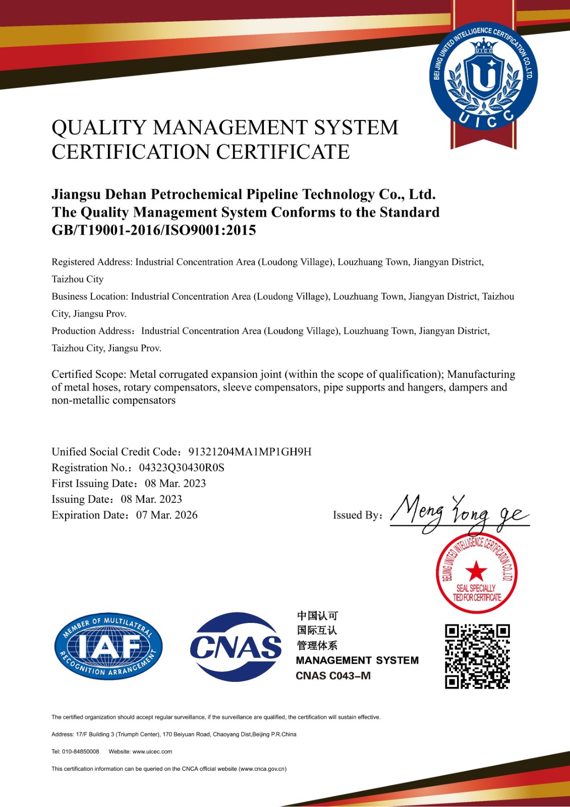 公司引進(jìn)大通徑的厚壁波紋管液壓成型設備及各種焊割、冷加工、精加工、檢驗、熱處理爐等設備,其中重要設備均采用國標數控系統。公司通過(guò)了ISO9001:2015質(zhì)量管理體系認證、ISO14001:2015環(huán)境管理體系認證、OHSAS18001:2007職業(yè)健康安全體系認證;同時(shí)取得特種設備生產(chǎn)許可證。